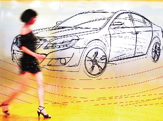 广州车展上,一女子走过某B级车展台展板。 曹海鹏