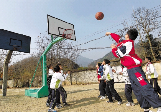 孩子们在新球架下欢快地打篮球。 本栏摄影:记者 林云龙