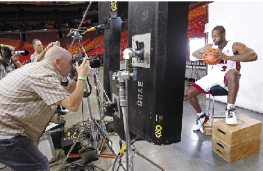 12月12日,热火队球员韦德(右)在配合摄影师拍摄肖像照。当日,迈阿密热火队在佛罗里达州迈阿密举行媒体日活动。 新华社发