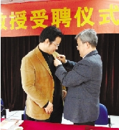 浙江大学副校长褚健为董强教授戴上浙大校徽。