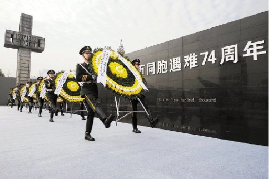 12月13日,武警战士在集会上为南京大屠杀遇难同胞敬献花圈。 新华社记者 韩瑜庆 摄