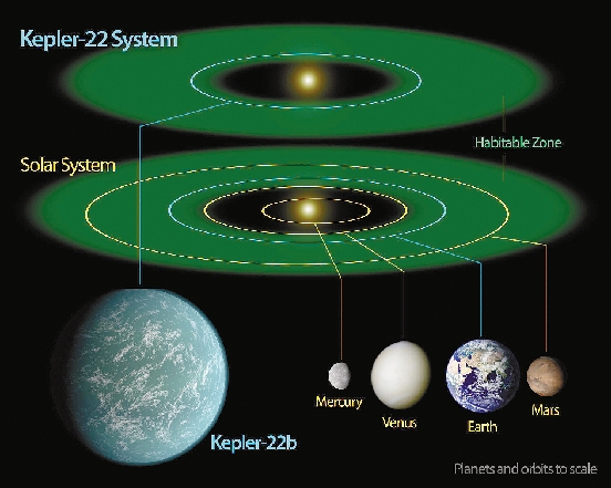 这是美国航天局12月5日公布的代号为“开普勒-22b”的行星所处恒星系统与太阳系比较的假想图。 新华社发