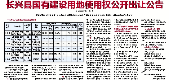 四、本次公开出让的详细资料和具体要求,见公开出让文件。申请人可于2011年12月20日至2012年1月6日(双休日除外),到长兴县雉城镇长海路361号长兴县招投标中心国土资源交易分中心获取出让文件。对于采用挂牌出让的宗地,申请人可继续于2012年1月9日至2012年1月21日到上述地点获取公开出让文件。