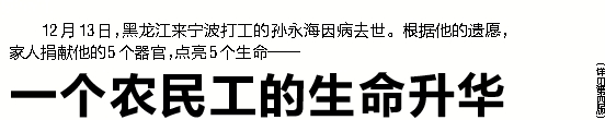 12月13日,黑龙江来宁波打工的孙永海因病去世。根据他的遗愿,家人捐献他的5个器官,点亮5个生命——