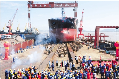舟山浙江正和造船有限公司7万吨级散货船下水现场。 江勇 徐丹 摄