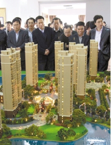 考察团成员在参观南白象农房集聚点金湖花园沙盘