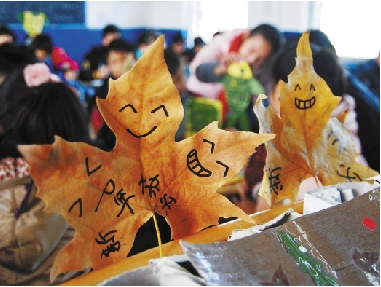 12月21日,建德寿昌初中的学生用五颜六色的树叶制作环保贺卡,送给老师、同学,表达美好新年祝愿。 宁文武 摄
