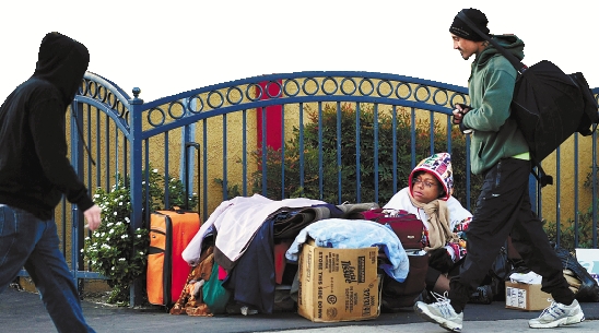 12月6日,在美国洛杉矶,一名无家可归的妇女携带家当坐在路旁。 新华社发