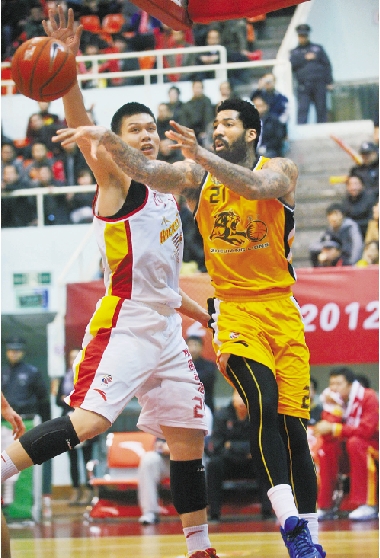 12月21日,浙江广厦队球员钱德勒(右)在比赛中传球。当日,在2011-2012赛季中国男子篮球职业联赛(CBA)第14轮比赛中,广厦男篮客场以97比90战胜八一双鹿电池队。目前,北京、广东、广厦、稠州银行暂列积分榜前四。 新华社发