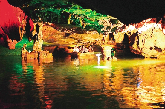 | 这是一条在地底下沉睡了二亿七千万年的暗河,全长共4.5公里,总面积为8万余平方米,河道最大落差380米。河水终年奔流不息,长年保持恒温18℃。据史料记载,早在三国、吴越时代就有游人涉足于此,现留有唐人摩崖石刻“垂云古迹”。明代诗人杨宏游览后禁不住脱口赞道:“夏日炎忘暑,冬游却似春,源流虽一派,清白只垂云。” 这就是位于杭州至千岛湖黄金旅游线上的桐庐垂云通天河景区。 顺河入洞,景象变幻无穷,亿万年岁月沧桑,在此留下了鬼斧神工的画卷。两岸乳笋林立,石峰参差,各种石笋、石花、钟乳,在彩色灯光照射下,五彩纷呈,姿态万千,或如银河倾斜而下,或如飞鸟展翅飞翔,也有九宵宫殿、一柱擎天、孔雀开屏、玉免望月、八仙聚会、弥勒坐禅、送子观音等独具神韵的景象,惟妙惟肖。 (曾素芳) |