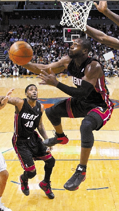 图为热火队球员德文·韦德(右一)在上篮。 新华社发