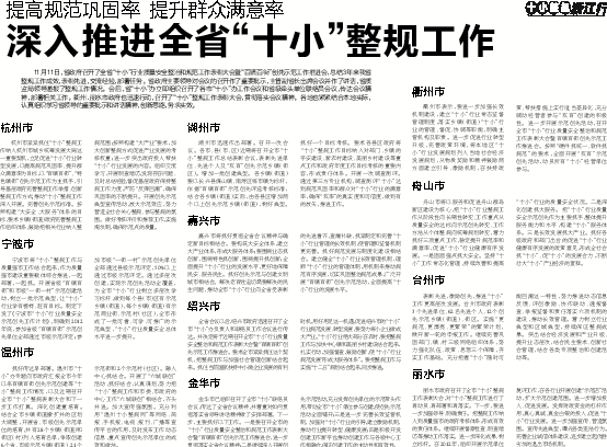 湖州市迅速作出部署。召开一次会议。各市、县(市、区)近期将召开全市“十小”整规工作总结表彰会议,表彰先进单位、先进个人及“双百”创先示范乡镇(街区)。增加一批创建典型。各乡镇(街道)要以长兴县煤山镇、南浔区练市镇为标杆,依据“百镇百街”示范创先评选考核标准,结合各乡镇(街道)实际,由各县区增加两个以上创先示范乡镇(街道),树好典型。抓好一个目标考核。要求各县区政府将“十小”整规工作目标纳入对部门、乡镇的平安建设、新农村建设、美丽乡村建设等重点工作和政府年度工作目标考核的重要内容,形成责任体系。开展一次调查测评。通过第三方专业机构,调查测评“十小”达到规范巩固率和群众对“十小”行业的满意率,确保“双率”的真实度和可信度,做到有的放矢,推进工作。