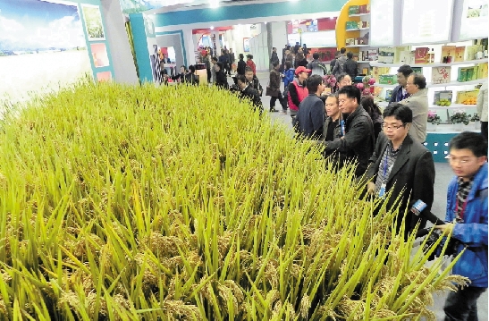 2011浙江农博会上,参观者观看甬优12号高产杂交水稻。龙巍 摄 (本报资料照片)