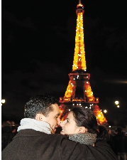 1月1日零点,一对情侣在法国巴黎埃菲尔铁塔下庆祝2012年的到来。