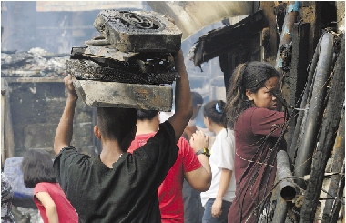 1月1日,在菲律宾首都马尼拉,一名居民搬运从烧毁后的民房废墟中找到的可用之物。据菲律宾官员透露,为迎接新年燃放的烟花已经造成数百人受伤。由烟花引发的大火也烧毁了多所房屋。 新华社发