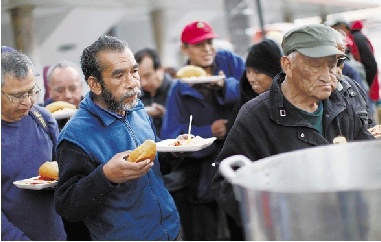 2011年12月31日,一些无家可归者和贫困人员在墨西哥首都墨西哥城市中心的一个广场上排队,领取免费“年夜饭”。 新华社发