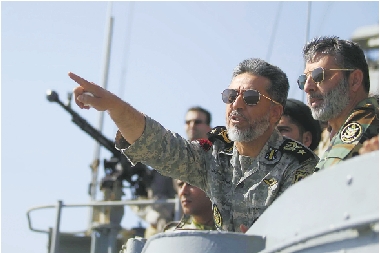 1月1日,在霍尔木兹海峡附近海域,伊朗海军司令哈比布拉·萨亚里(前左)在一艘海军舰船上查看演习情况。 新华社发