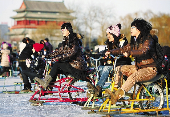 ↑ 1月2日,年轻人在北京什刹海冰场骑冰上自行车。 新华社发