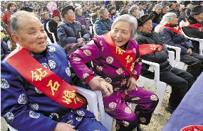 1月2日,富阳市新登镇双联村为7对钻石婚老人举行庆祝活动,弘扬慈孝文化。 吴海森 摄