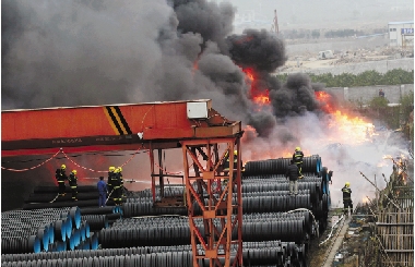 1月3日下午,温州龙湾区瑶溪街道一管业公司堆场发生火灾。经过40多名消防官兵奋力扑救,火势才被压住,所幸没有人员伤亡。 郑鹏 摄