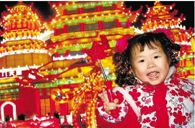 1月5日晚,在四川省自贡市彩灯公园里,一名小朋友在大型彩灯前留影。 新华社发