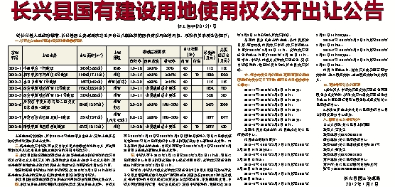 四、本次公开出让的详细资料和具体要求,见公开出让文件。申请人可于2012年1月12日至2012年2月2日(双休日除外),到长兴县雉城镇长海路361号长兴县招投标中心国土资源交易分中心获取出让文件。对于采用挂牌出让的宗地,申请人可继续于2012年2月7日至2012年2月20日到上述地点获取公开出让文件。