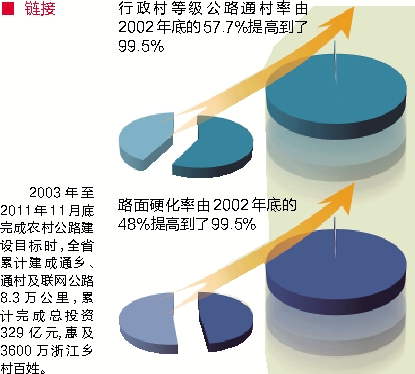 2003年至2011年11月底完成农村公路建设目标时,全省累计建成通乡、通村及联网公路8.3万公里,累计完成总投资329亿元,惠及3600万浙江乡村百姓。