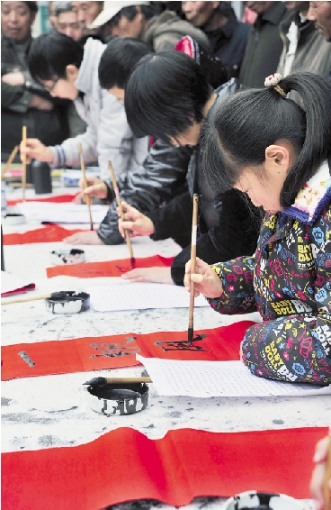 1月10日,温岭市松门镇十几位小学生在镇迎宾大道上写春联送给路人,祝福大家过一个好年。 朱海伟 潘国志 摄