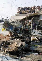 巴基斯坦西北部开伯尔部落地区贾姆鲁德市一个出租车站10日上午发生一起爆炸袭击事件,造成至少26人死亡、50多人受伤。巴基斯坦塔利班当天宣布制造了这起爆炸事件。图为人们聚集在爆炸袭击现场。 新华社发