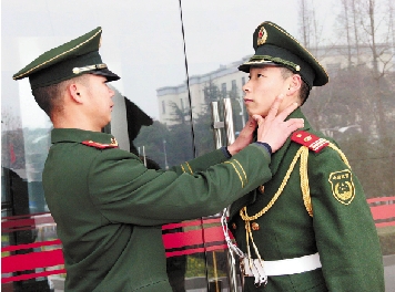 在省人民大会堂执勤的武警战士调整军姿。廖小清 摄