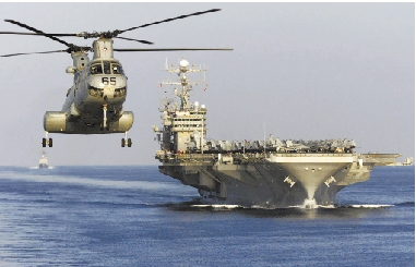 一架CH-46型“海洋骑士”直升机飞翔在美国“卡尔·文森”号航空母舰旁(资料照片)。 新华社发