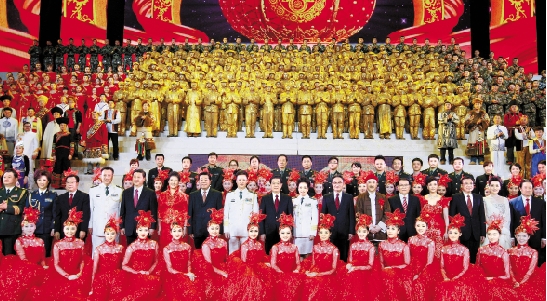 | 1月14日,2012年军民迎新春文艺晚会在北京人民大会堂举行。胡锦涛、吴邦国、贾庆林、李长春、习近平、李克强、贺国强、周永康等党和国家领导人出席晚会,与首都军民欢聚一堂,共贺新春。演出结束后,胡锦涛等走上舞台与演职人员亲切握手,祝贺演出成功。 新华社记者 王建民 摄 |
