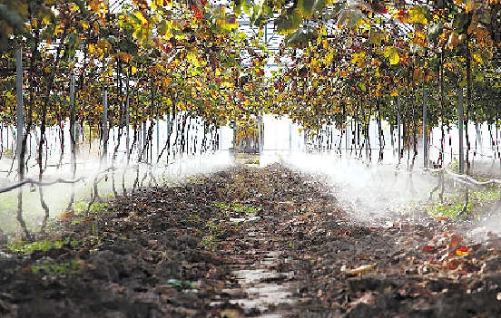 嘉兴市南湖区大桥镇的葡萄田里,技术员通过用手机对大棚葡萄内的空气温湿度、土壤水分含量等进行实时检测,并实现自动灌溉。