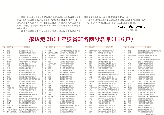 根据《浙江省企业商号管理和保护规定》和《浙江省知名商号认定办法》的规定,为保证浙江省知名商号认定工作的公正、公平和公开,现将浙江省知名商号评审委员会通过的2011年度浙江省知名商号名单予以公告。自公告之日起30日内,任何人均可向省工商行政管理局提出异议。