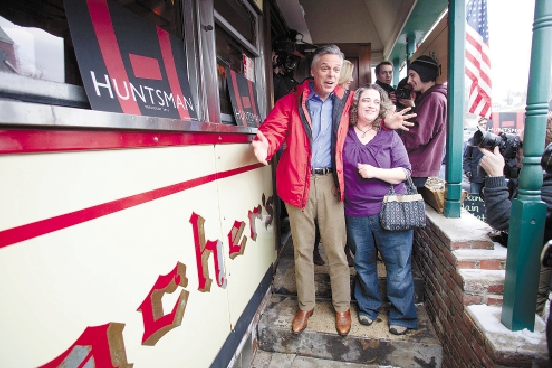 1月7日,在美国新罕布什尔州普利茅斯,前驻华大使洪博培(左)与支持者合影。 新华社发