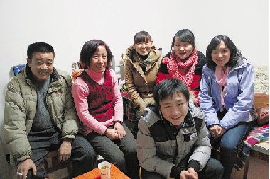记者(右一)和李让军全家在职工宿舍合影。通讯员 吴铖 摄