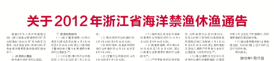 根据《中华人民共和国渔业法》、《浙江省渔业管理条例》和“农业部通告〔2012〕1号”有关规定与要求,结合我省实际,现将2012年我省海洋捕捞禁渔休渔规定通告如下:
