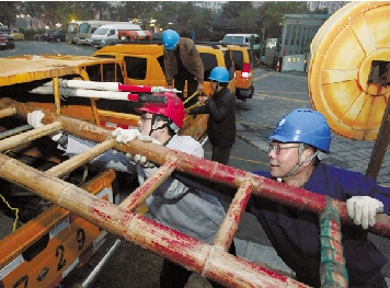 1月20日傍晚,宁波电业局汽车运行工区员工正往抢修车上安放工具,做好应对雨雪冰冻天气的准备。 胡建华 邬晓钢 黄国兴 摄