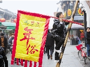 杭州河坊街“年俗”的旗帜扬起来,统领着满街大红灯笼、彩灯,展示着浓浓的古老年味。