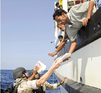 右上图:1月18日,在阿拉伯海中部海域,美军向一艘即将沉没的伊朗渔船提供食物。这是美军本月第三次救助伊朗船员。 新华社发