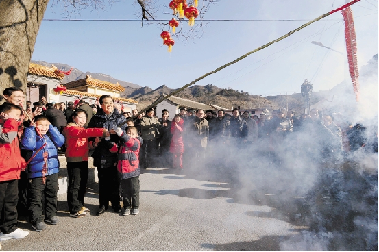 1月22日农历除夕,中共中央总书记、国家主席、中央军委主席胡锦涛到北京城乡看望慰问基层干部群众,同大家共迎新春佳节。这是胡锦涛在怀柔区田仙峪村与村民们一起燃放鞭炮,祝愿乡亲们新春快乐、阖家幸福。 新华社记者 李涛 摄