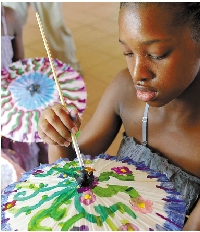 ➝ 1月22日,在位于南非布龙克霍斯茨普雷的南华寺举行的中国文化嘉年华会上,一位小朋友在参加绘伞活动。