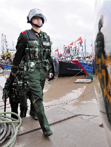 昨日,苍南县龙港边防派出所官兵在港口码头巡逻检查。 吴水斌 摄