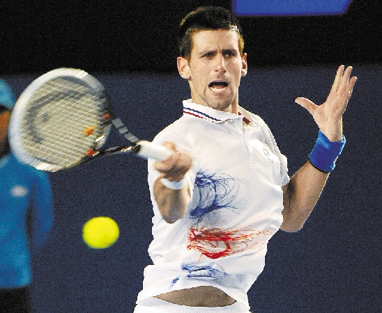 1月25日,在2012年澳大利亚网球公开赛男子单打四分之一决赛中,焦科维奇以3比0战胜西班牙选手费雷尔,拿到了澳网最后一个男单四强席位。这也是世界排名前四的焦科维奇、纳达尔、费德勒和穆雷首次齐聚澳网四强。焦科维奇在半决赛的对手将是4号种子穆雷。图为塞尔维亚选手焦科维奇在比赛中回球。 新华社发 |