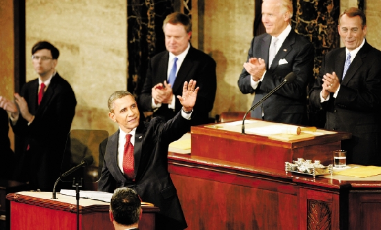 1月24日,美国总统奥巴马(前)在位于华盛顿的国会山发表国情咨文前向众人挥手致意。 新华社记者 方喆 摄