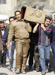1月27日,在伊拉克首都巴格达南部扎法拉尼耶区,当地居民搬运爆炸遇难者的灵柩。当天,巴格达遭遇连环爆炸袭击,致死至少69人。 新华社发