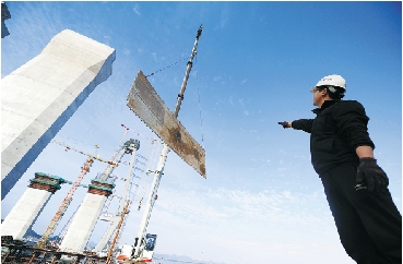 在台州市椒江二桥工地上,建设者们放弃节日休息,坚守在工地吊装钢板。