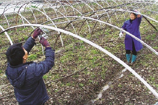 1月26日,温岭市新河镇三邵村颜云才夫妇在承包地里捆扎大棚顶杆,为种植西瓜作前期准备。