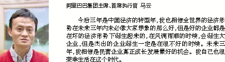 今后三年是中国经济的转型年,我也相信全世界的经济形势在未来三年内未必像大家想象的那么好,但是好的企业都是在坏的经济形势下诞生起来的,在风调雨顺的时候,会诞生大企业,但是杰出的企业诞生一定是在很不好的时候。未来三年,我相信是民营企业真正成长发展最好的机会。我自己也很荣幸生活在这个时代。
