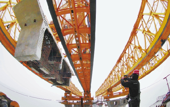 昨日下午,在嘉绍大桥工程第七标段,建设者把一片重达150多吨的节段箱梁,从作业平台向上升高40米后滑动到桥墩上,完成了龙年第一片箱梁的架设。 海宁日报记者 王超英 通讯员 孟庆虎 摄